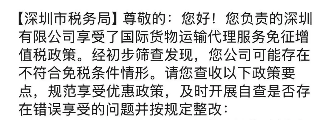 连日来,深圳数十家国际货运代理企业陆续收到了深圳市税务局发来的税务核查短信及书面通知。一场针对“国际货物运输代理服务免征增值税”政策合规性的专项排查,正悄然拉开帷幕。